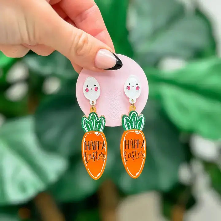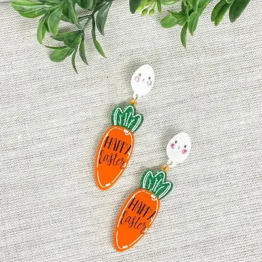 These 'Happy Easter' Carrot Dangle Earrings are a festive and playful addition to any outfit. The dangling carrot design adds a touch of joy and the perfect pop of color. Celebrate Easter in style with these charming earrings.