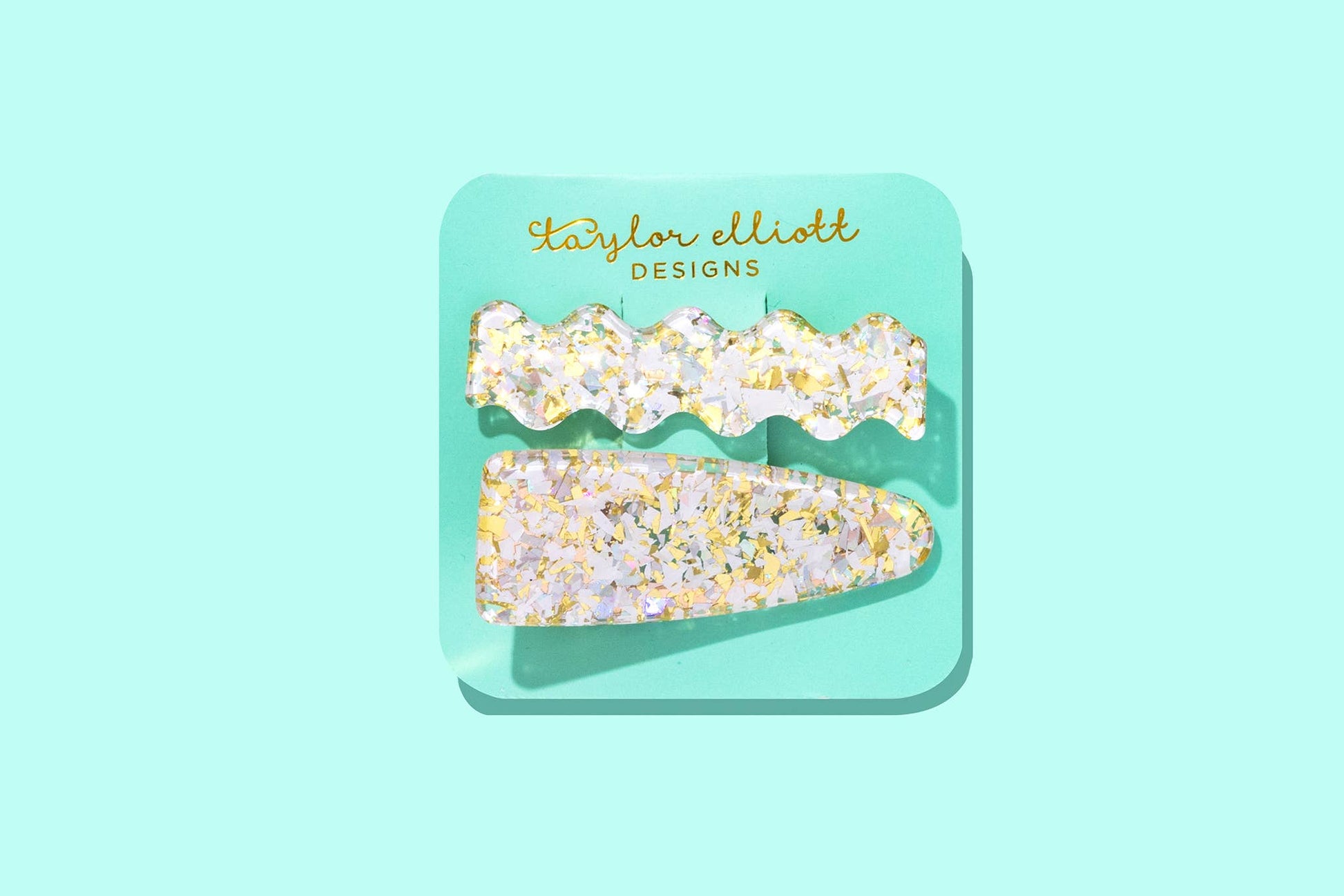 Add personality to your store with our vibrant and one-of-a-kind hair clip set! Bursting with fun and flair, our wide array of hair clip sets promise to transform any look with a playful twist, making it a must-have addition to your hair accessory lineup. Details * 2 clips * Clip size: 2.5" * Backer card size: 3" x 3" * Pearl confetti * Gold ric rac ribbon hanger on back of card * Imported The confetti is hand-sprinkled into the acrylic, which means no shedding. Because of this unique process, no two pieces will be exactly alike.