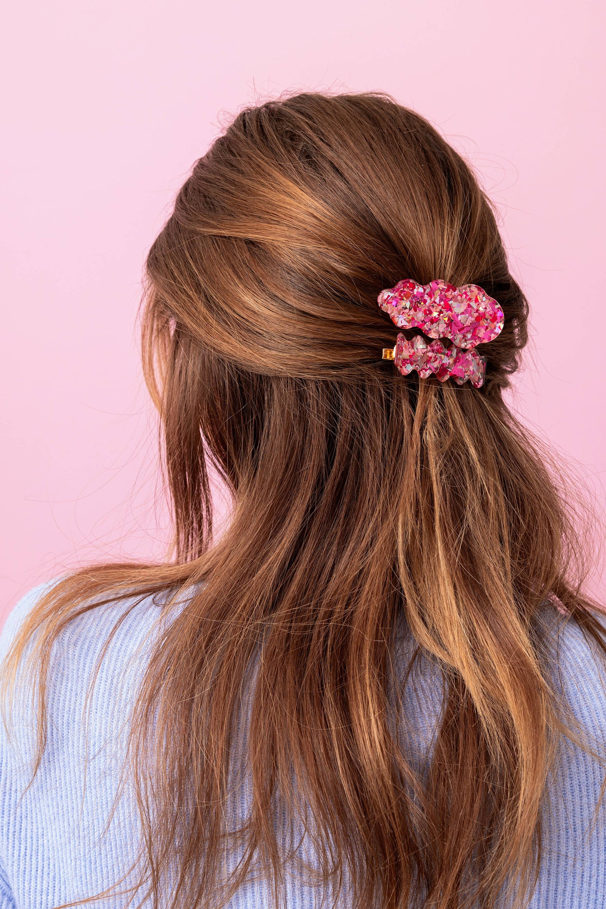Add personality to your store with our vibrant and one-of-a-kind hair clip set! Bursting with fun and flair, our wide array of hair clip sets promise to transform any look with a playful twist, making it a must-have addition to your hair accessory lineup. Details * 2 clips * Clip size: 2.5" * Backer card size: 3" x 3" * Pink confetti * Gold ric rac ribbon hanger on back of card * Imported The confetti is hand-sprinkled into the acrylic, which means no shedding. Because of this unique process, no two pieces will be exactly alike.