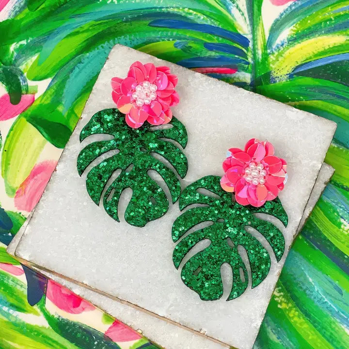 Add a touch of glam to your ensemble with our Floral Monstera Glitter Statement Earrings. Boasting a length of 2.90", these dangle earrings are both lead and nickel compliant, ensuring a comfortable wear. Coming from Prep Obsessed Wholesale, these earrings are a testament to our commitment to delivering unique finds. Get ready to make a statement with these sparkling beauties!