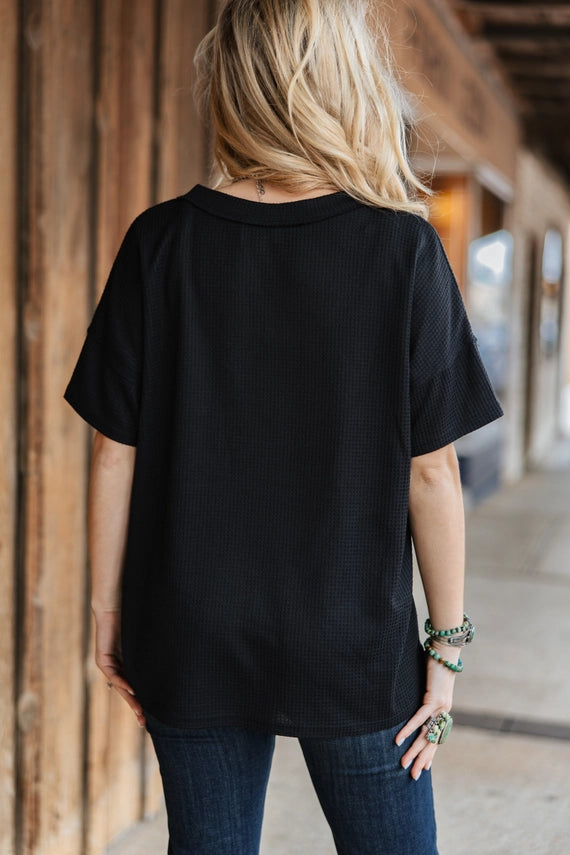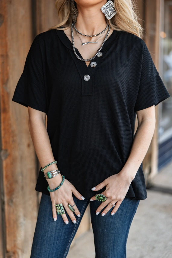 Button-down waffle short-sleeve top featuring a waffle knit with a relaxed fit. Nonsheer, knit, stretchy,