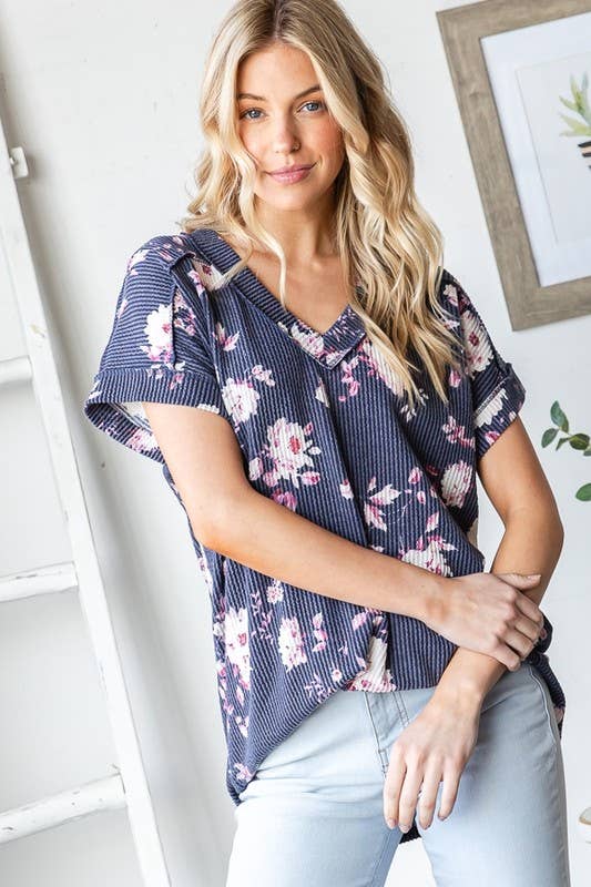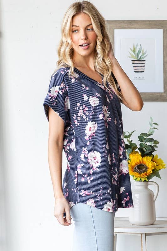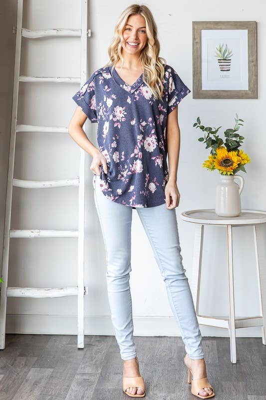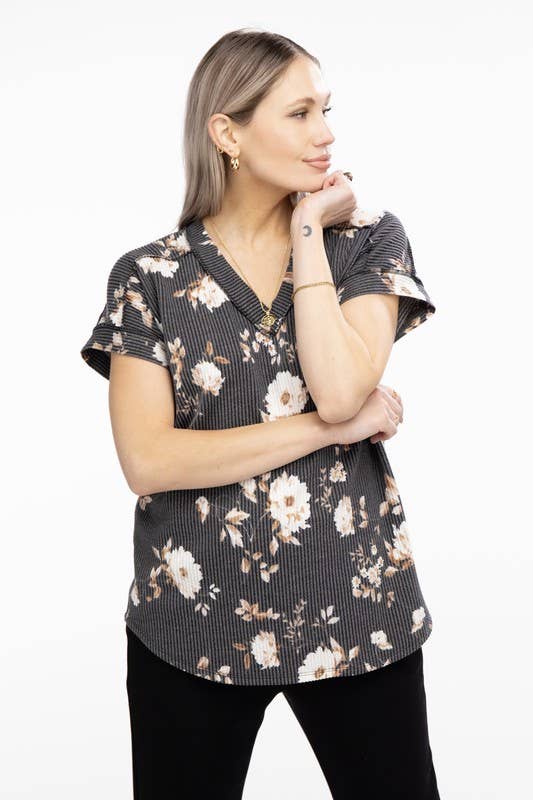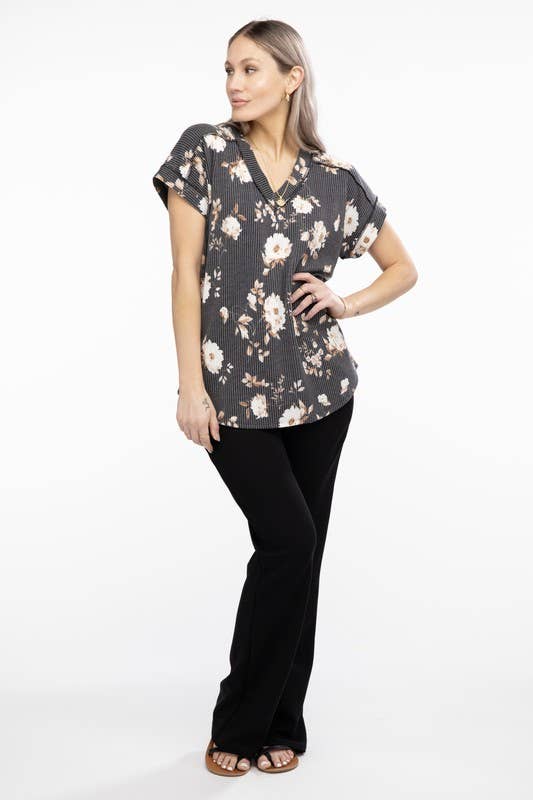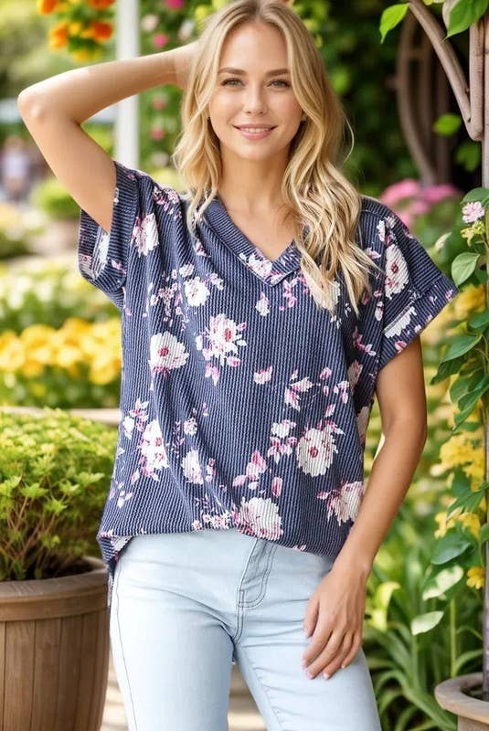 Bloom into style with this charming floral print top! Crafted from a comfy 95% polyester and 5% spandex blend, it features a flattering dolman short sleeve design with a chic banded V-neck. The rounded hem and delicate stitch detailing add a touch of sophistication. Perfect for casual outings or dressing up your everyday look. Note: Colors may vary slightly due to professional photography lighting and device displays.