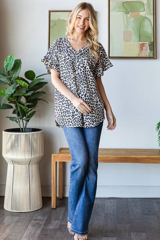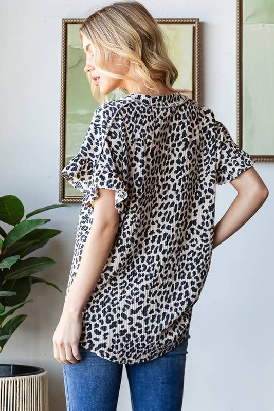 Make a bold statement with this edgy animal print urban ribbed top! Designed in a stretchy 95% polyester and 5% spandex fabric, it features a playful ruffled V-neck and short sleeves that bring attitude to any outfit. The reverse stitch detailing adds an unexpected edge to this versatile piece. Available in Regular and Plus sizes to fit your style. Heads up: Colors may appear slightly different upon arrival due to professional photography lighting and your device's display settings.