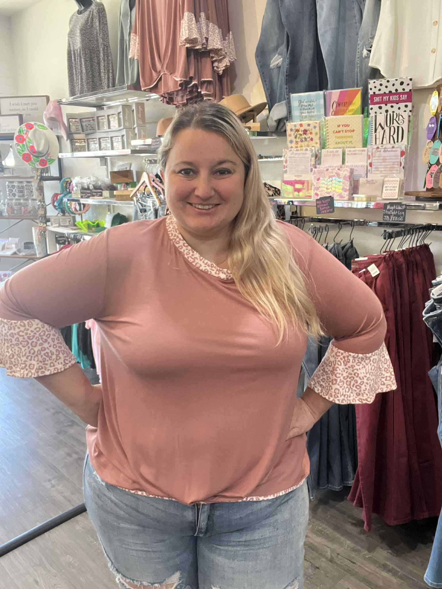 Add a playful touch to your wardrobe with this Animal Print Bell Sleeves Gathered Hem Top. The contrasting bell sleeves bring flair, while the gathered front hem adds a fun, flattering shape. Made from a soft blend of rayon, polyester, and spandex, it offers comfortable stretch and easy movement for all-day wear. Perfect for mixing style and comfort effortlessly.