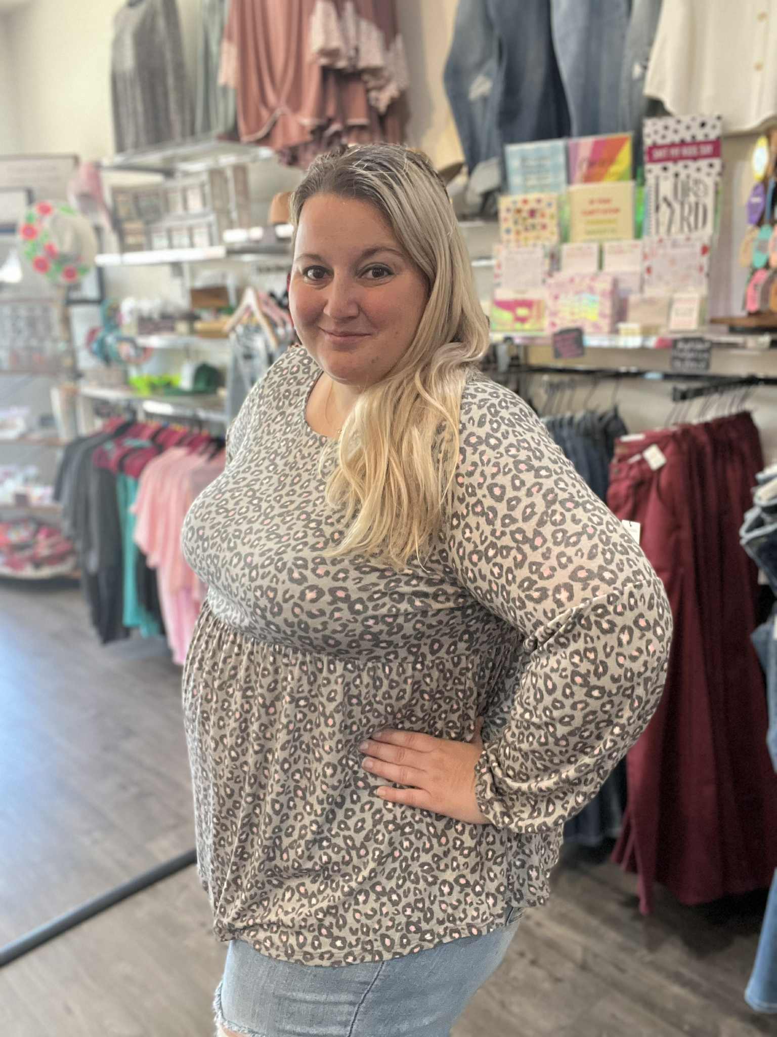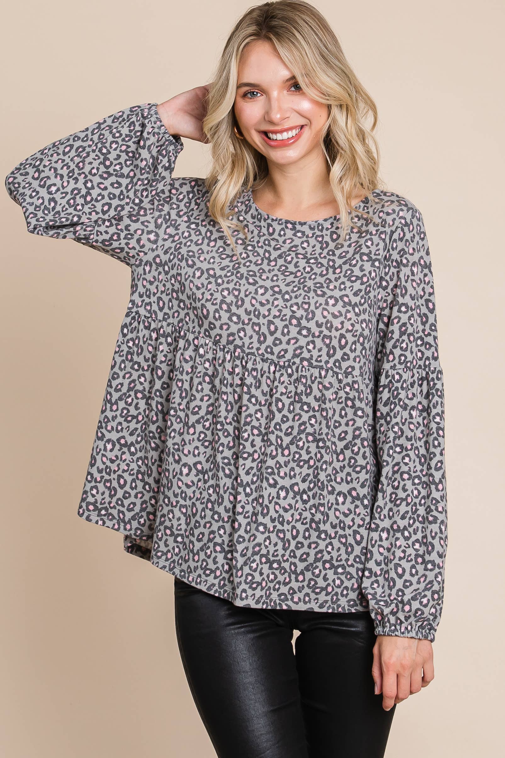 Play up your style with this Animal Printed Babydoll Top, featuring fun balloon sleeves and elastic cuffs for a comfortable, flirty fit.