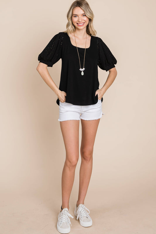 Eyelet Bubble Sleeves Solid Knit Top