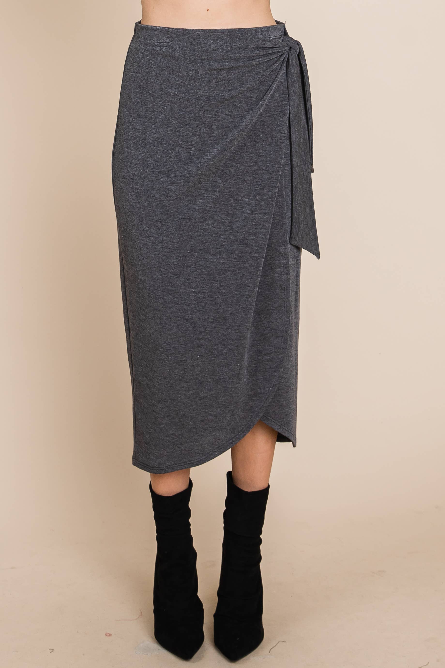 Add a flirty twist to your wardrobe with this Faux Wrap Midi Skirt! Crafted from a comfy blend of polyester, rayon, and a hint of spandex, it moves with you while hugging your curves just right. Perfect for twirling through your day or dressing up for a night out, this skirt effortlessly blends style and comfort in one playful package.
