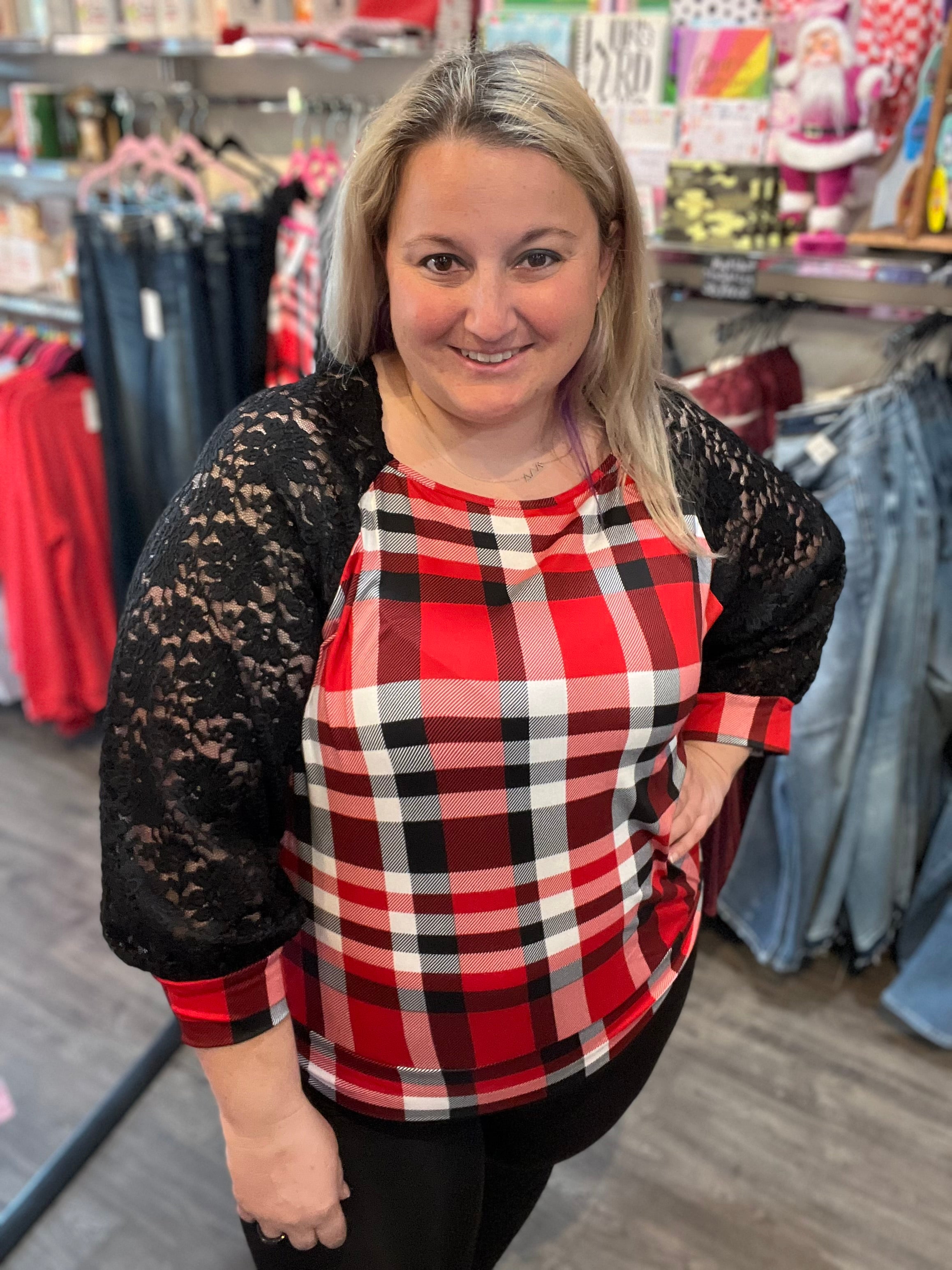 Add a flirty twist to your wardrobe with this Red and Black Plaid Top featuring delicate lace sleeves! Its long sleeves and flattering fit blend cozy cotton with a touch of stretch for comfort and style. Whether you're dressing up or keeping it casual,