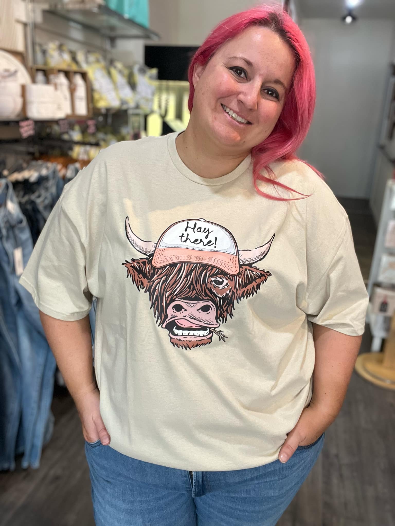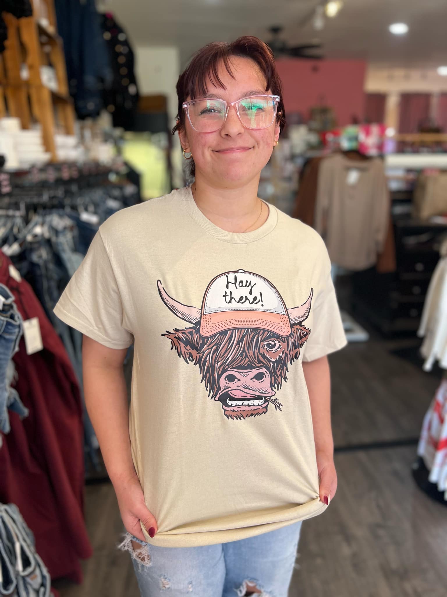 Get ready to moo-ve in style with the Hay There! graphic tee. Featuring a playful cow chewing hay in a trendy baseball hat, this shirt is perfect for any casual day out on the farm. Ewe won't want to miss out on this quirky and fun addition to your wardrobe.