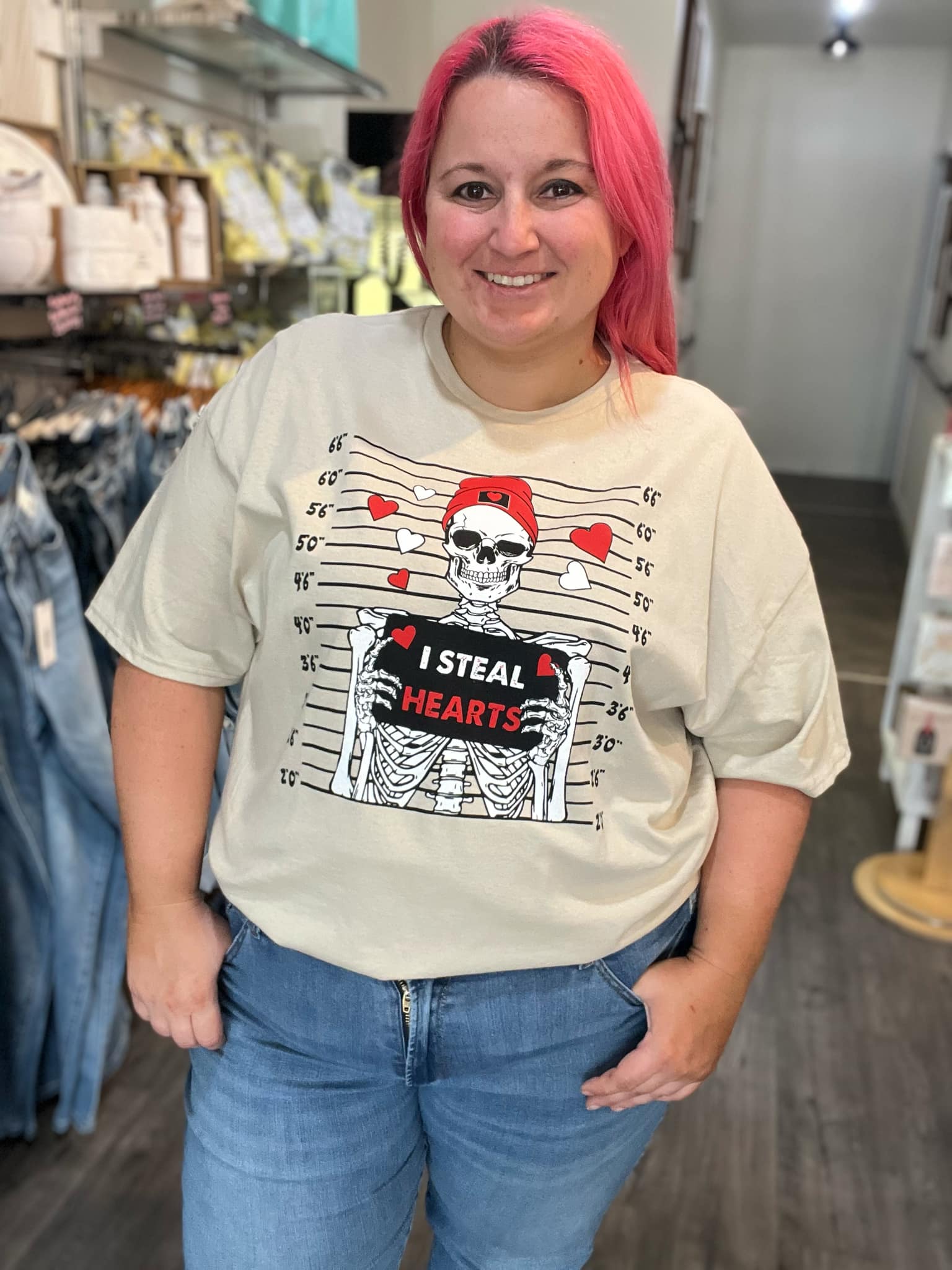 Get ready to steal hearts with this unique shirt featuring a playful skeleton mugshot design.