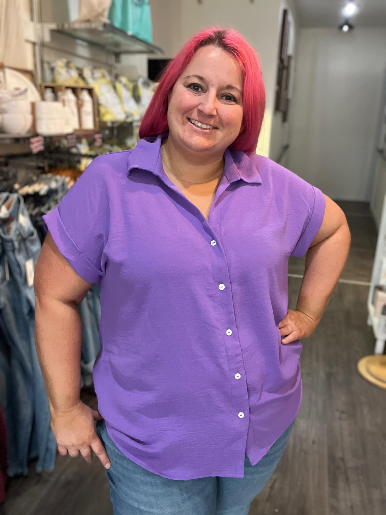 Easy woven blouse with collar detail and front button-down detail. Dolman sleeves with pleated on the back. Easy to wear with a flattering knit. Nonsheer, woven with stretch.