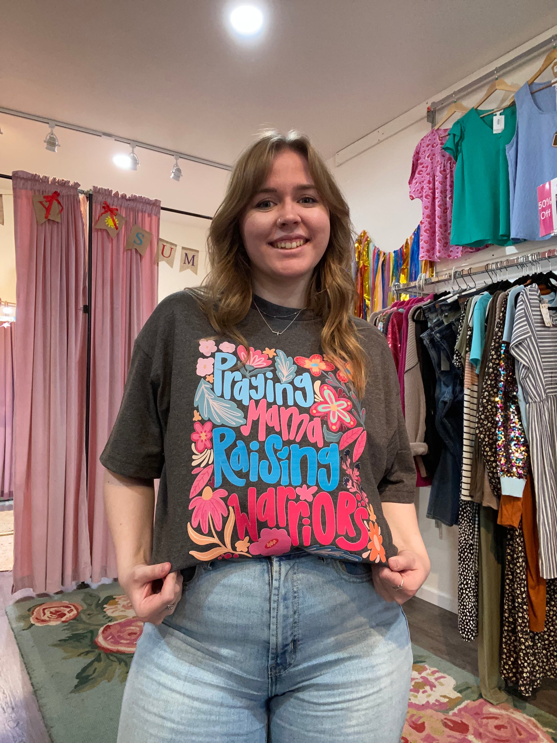 "Empower yourself as a praying mama with our Raising Warriors graphic tee. Show off your strong and fearless spirit while raising your little warriors. A must-have for any fierce and playful mom!"