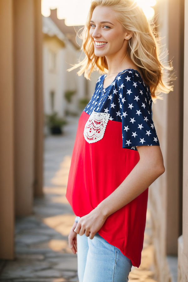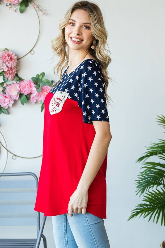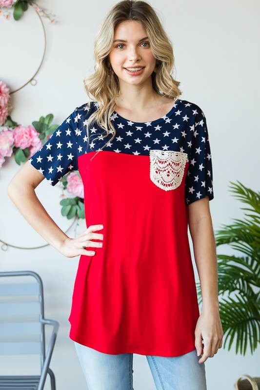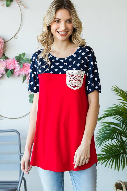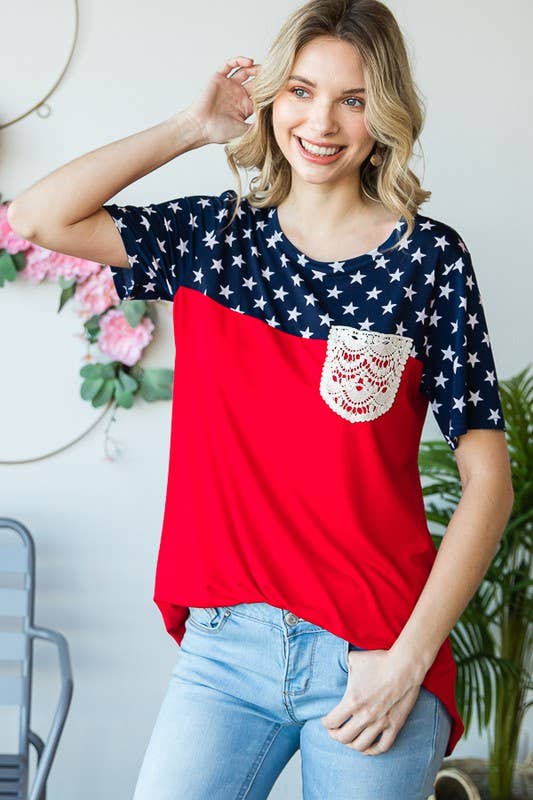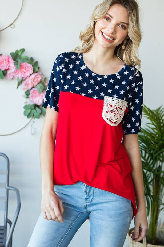 Celebrate patriotic style in this Fourth of July-inspired star print contrast top. Crafted from a comfortable 95% rayon and 5% spandex blend, this short sleeve round neck tee features eye-catching solid and star print panels with charming lace pocket detail. The soft, breathable fabric drapes beautifully and moves with you all day long.